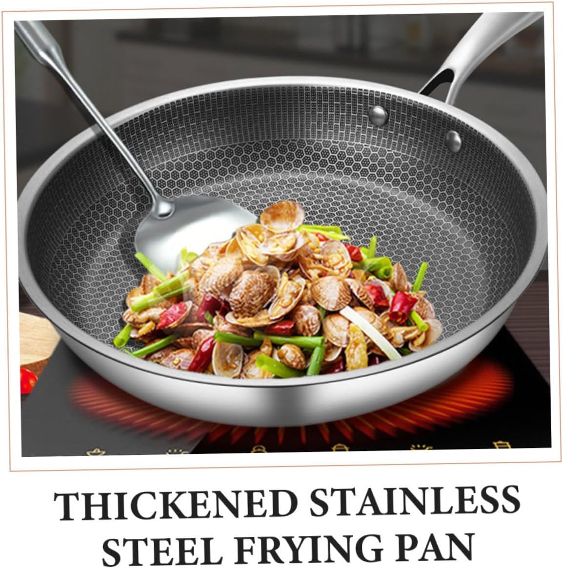Package List 1 x stainless steel wok Characteristics - Material:Stainless Steel stainless steel fry pan - Size: 56.00X34.00X10.20cm/22.01X13.36X4.01in honeycomb wok - The frying wok can be placed directly on the grill to heat the product. Not easy to stick to the pot, easy to clean honeycomb frying pan. - ColorSilver kitchen cookware - Great for making BBQ, fried potatoes, fried , steaks, sausages, vegetable, meat, etc honeycomb frying wok. - This pot is convenient to clean, save time, let you fall in with cooking. Control the size of the fire, the flame should not over the pot body edges wok stainless steel. - Characteristic and with Honeycomb Grain design. Simple and generous , smooth in lines wok frying pan. - The handle of the pan is ergonomically designed to make it easy to hold and won't burn your hands while cooking honeycomb structure wok.Goods Descriptionwok pan for gas stove This product is a frying wok pan.frying wok An excellent frying wok pan that can bring you more convenience, allowing you to have comfortable experience.stainless steel cookware It can serve you for longtime without being easily damaged