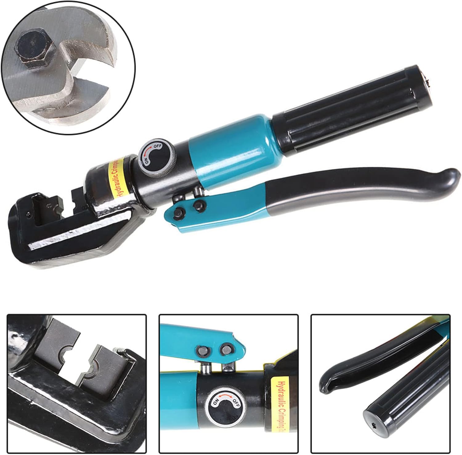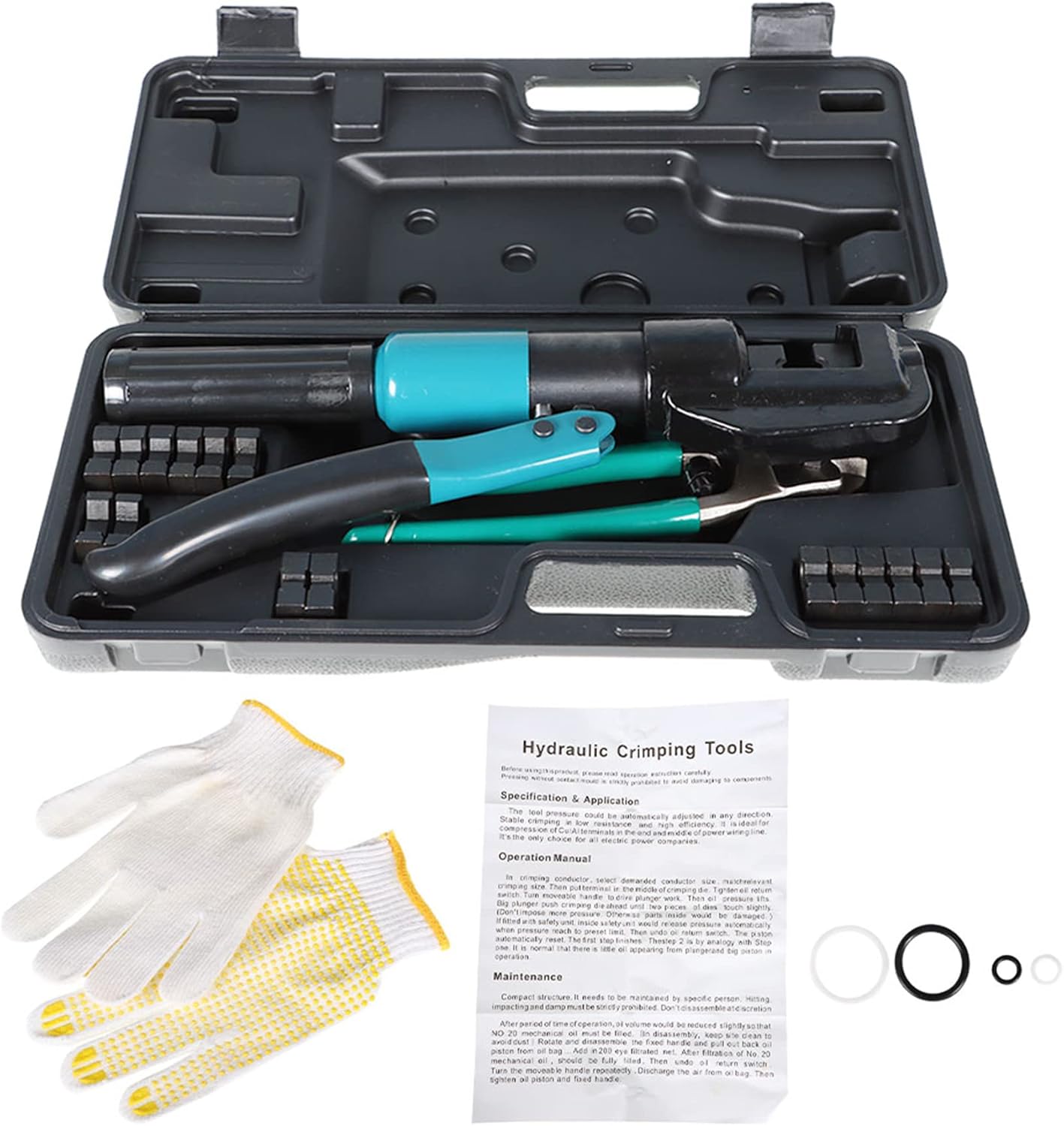 Specification:Max pressure: 10 Ton9x dies: 4, 6, 8, 10, 16, 25, 35, 50, 70mm2Fitting for: 1/8" to 3/16" CableCase dimension: 14.17"L x 6.30"D x 3.15"HFeatures: 10 Ton Wire Swaging Tool: Black Crimping Dies-Comes with crimping dies for 10 AWG, 9 AWG, 8 AWG, 6 AWG, 4 AWG, 2 AWG, 1 AWG, 1/0 AWG and 2/0 AWG cables.Durable Material: Made of durable materials, high strength and good toughness. And dies are made of hardened steel with chrome finish.Wide Application: It is equipped with 9 sets of the crimping dies. Good choice for battery and welding cables, power wires, electrical cables, etc. Fitting for 1/8" to 3/16" Cable.Distinctive Design: The cable cutter has unique angled blades that never leave a frayed cut and it features hardened steel blades, center bolt in high-quality hardened steel, thumb catch designed for one-handed operation, and contoured cushion rubber handle non-slip grips. Cuts up to 5/32" stainless steel cable.Package Included: 1 x Cable Cutter1 x Hydraulic Crimper9 x pairs of hexagon crimping dies(4,6,8,10,16,25,35,50,70)mm24 x seal rings1 x Work Gloves1 x Instruction1 x Plastic Box