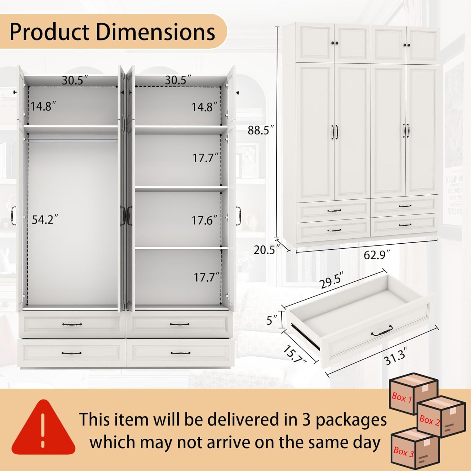 Modern Minimalist, Effortlessly Blends into Your Home: This wooden closets for bedroom features a modern minimalist design paired with classic black metal handles, offering an elegant and refined look that complements a variety of interior styles. Whether placed in a bedroom, walk-in closet, or guest room, the sleek appearance of the white armoire wardrobe closet with hanging rod enhances your home’s ambiance, making your space feel tidier and more stylish. Spacious Design to Meet Your Storage Needs: Measuring W62.99"*D8.07"*H88.58", the amour closet for bedroom makes perfect use of vertical space, allowing you to easily store all types of clothing and belongings. The wood wardrobe closet for hanging clothes features a generous storage capacity, ideal for families that require ample storage—making it a smart and practical solution. Thoughtful Layout for Organized Living: The interior of the clothes cabinet for bedroom is thoughtfully arranged with a large top cabinet for storing infrequently used items like bedding, a central hanging area designed specifically for clothing, and spacious lower drawers in the wooden wardrobe closet with doors for organizing smaller items such as underwear and accessories. Every part of the white wardrobe closet for hanging clothes is designed with functionality in mind to help you maintain a clean and orderly living space. Durable Materials, Safe and Reliable: The large wardrobe closet with doors is made from high-quality engineered wood that is both sturdy and durable, with a waterproof and scratch-resistant finish that’s easy to clean. For added safety, the almirah for clothes wooden comes with an anti-tip kit to securely anchor the wardrobe to the wall—perfect for households with children or pets. Easy Assembly & Customer Support: Due to its size and weight, the wood wardrobe closet with drawers is shipped in three packages, which may arrive separately—thank you for your patience. Each piece of the wardrobe closet armoire closets is clearly labeled and includes detailed illustrated instructions, making assembly simple and tool-friendly without the need for professional skills. If you have any questions, our dedicated support team will be happy to assist you within 24 hours.