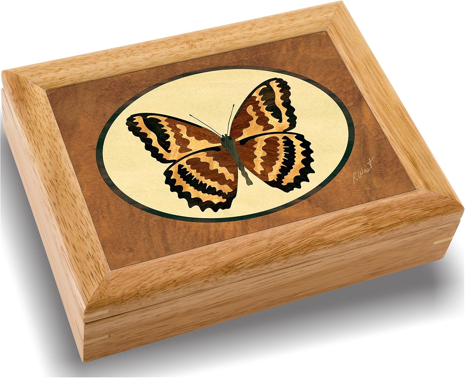 | Color | BUTTERFLY BOX (#4124 size: 4"x5"x1.5"). . . . An original work of art - No two are the same - Each is unique . . . . A label comes inside each Jewelry Box that explains the wood species that were used in its creation . . . . This Design shows 16 individual pieces and 6 unique wood species . . . . Each wood shown has its own unique wood grain pattern and color. |