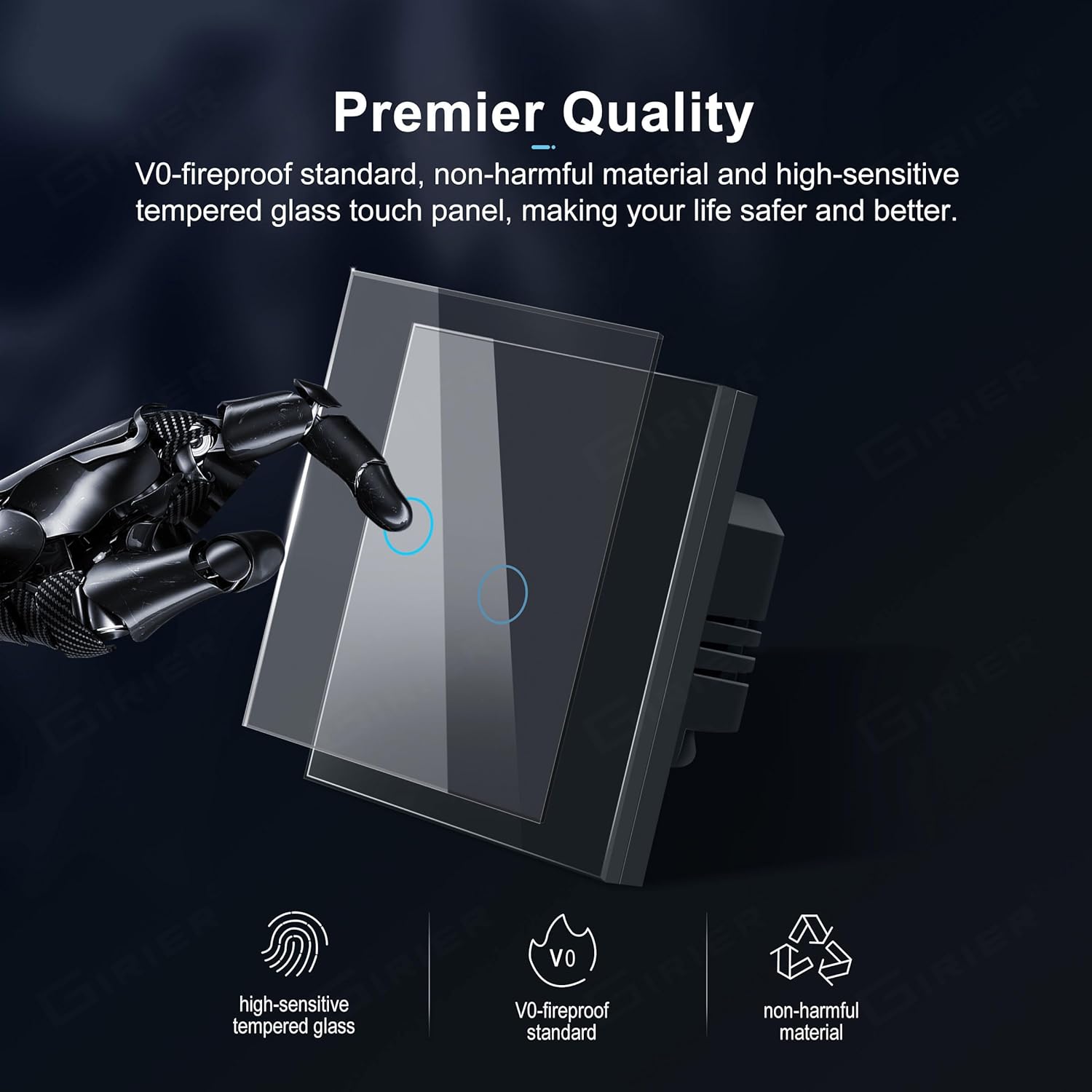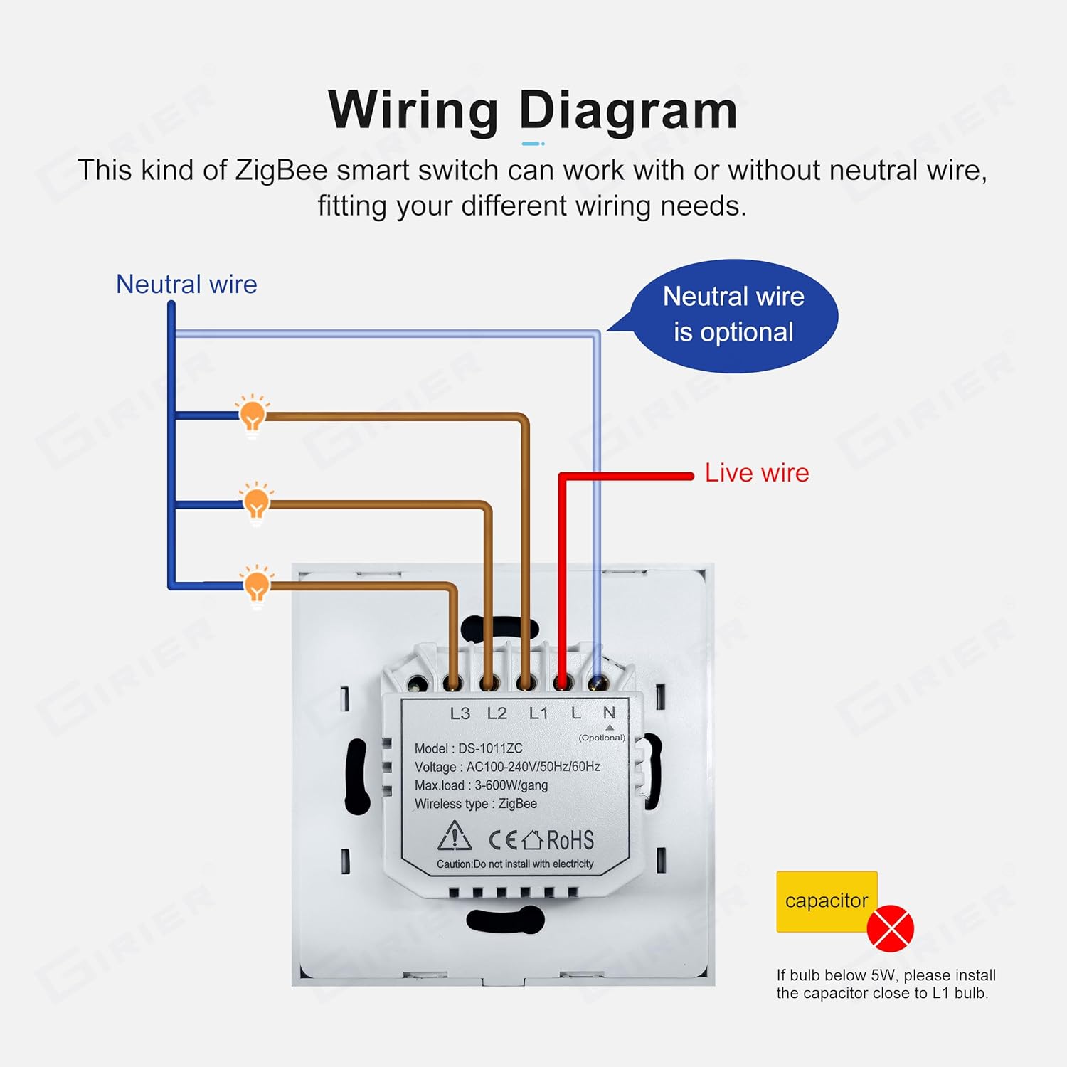 Tuya ZigBee Smart Touch Switch EU Neutral or No Neutral Wire Required Smart Light Switch 1/2/3 Gang 100-240V Tuya Zigbee Hub Required Experience unparalleled convenience with our Tuya ZigBee smart touch switch. It features a highly sensitive touch panel and a robust PCB to ensure exceptional performance. In addition, our switch requires no capacitors if the bulb is over 5W, ensuring a hassle-free installation process. Crafted from premium and eco-friendly materials, our product will enhance your modern living experience. Tuya ZigBee hub is a must for paring and APP control. After pairing the switch to Tuya Smart or Smart Life APP via Tuya ZigBee hub, you can remotely control the ZigBee light switch wherever and whenever you are. Through smart speakers and smart voice assistants(Echo / Dot / Dot / Tap / Assistant / Home / IFTTT)voice control is achieved With the smart ZigBee switch and the timer set in the APP, you can turn it on or off at a specified time, saving both time and energy while making your life more convenient and smarter. It's easy to connect the smart ZigBee wall switch to other Tuya Smart devices, easily creating your unique smart automation system, such as smart go/leave home mode. With its V0 fireproof standard and the use of non-harmful materials, this device's touch panel is exceptionally sensitive and ensures a safer life experience. This ZigBee light switch is designed to work efficiently with or without neutral wires, allowing you to choose the wiring that best suits your needs. Forget about the hassle of installing capacitors for bulbs over 5W, as the switch does not require it. You can now enjoy an easier and more seamless installation process. This slight indicator will remain inconspicuous and can be conveniently switched on and off within the APP.