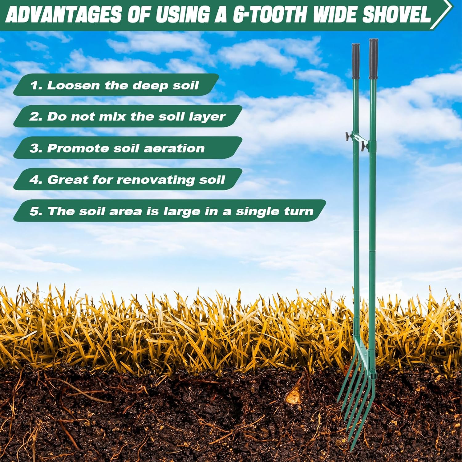 Features: This wide fork is an essential gardening tool, suitable for a variety of gardening tasks such as turning over manure, loosening soil, or moving mulch, straw, hay, or garden debris. It is also suitable for harvesting root crops (potatoes, sweet potatoes) and for composting, aeration, transplanting, tilling, and weeding. Please note that it is not suitable for loose, sandy soil. Our broad fork features special striking green design, meeting your needs for both practicality and aesthetics. Specifications: Material: mainly steel Color: green Size: about 59 inches tall and 16 inches wide Weight: about 13 pounds Package includes: 1 X garden broadfork Notes: Manual measurement, please allow slight errors on size. The color may exist a slight difference due to different screen displays. Small parts included, please keep them away from little kids to avoid swallowing risk. Pointed items are included, please be careful when using and please keep them away from kids