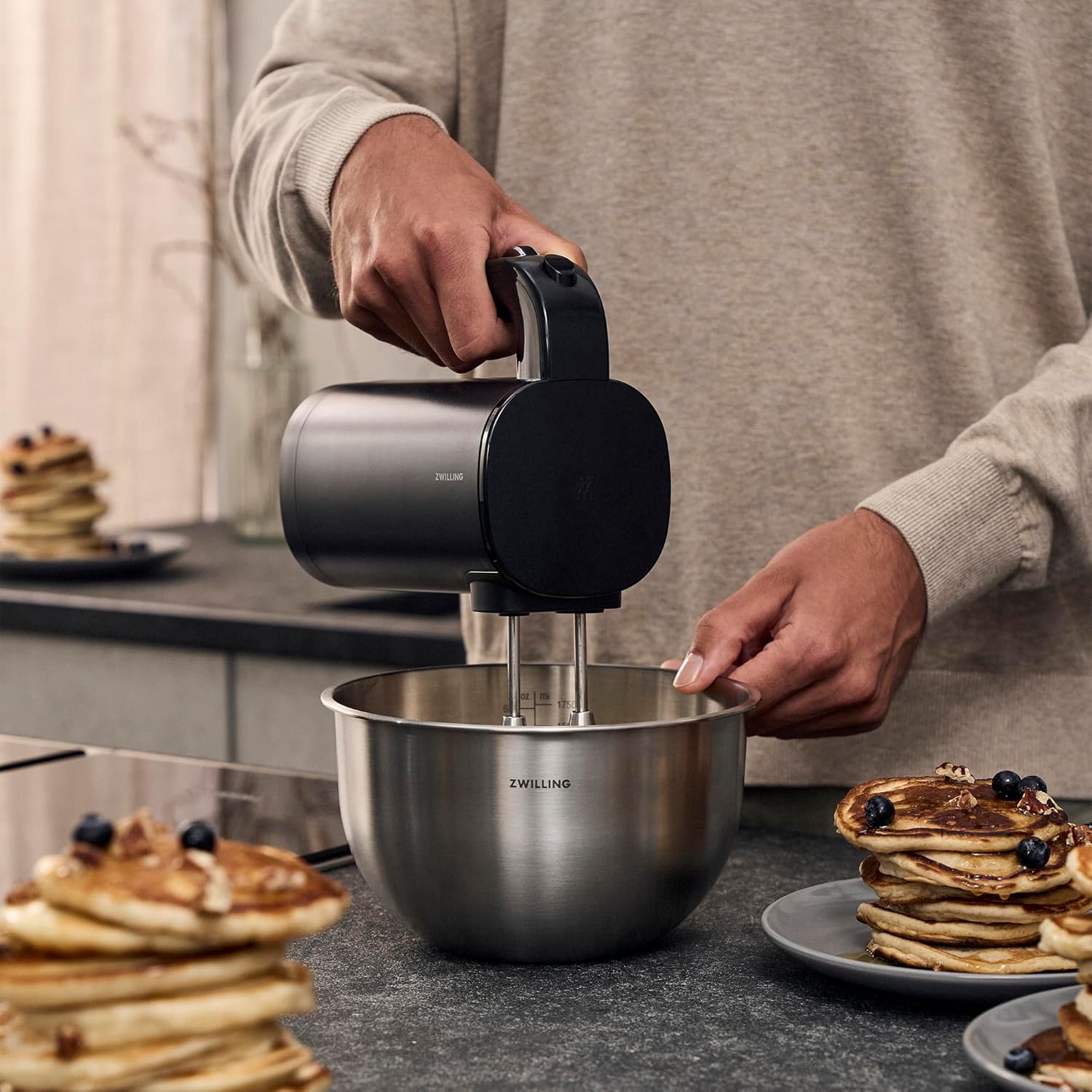 The ZWILLING XTend Cordless Mixer (INDIVIDUAL ITEM NO BATTERY, NO CHARGER INCLUDED) makes light work of any task with its powerful motor and versatile kneading and whisking attachments. With the convenience of a single battery charge, you can whip up delicious treats and create culinary masterpieces with ease. How will you elevate your baking game with the ZWILLING XTEND Cordless Hand Mixer? Full power. No cord. Discover ultimate freedom in the kitchen and xtend the boundaries of your meal prep with this space-saving & high-performance solution. At the heart of our system, the powerful lithium-ion battery seamlessly integrates into each appliance, and features a 50% longer lifetime and battery capacity than other cordless systems. The best part? You can use it to charge other compatible devices. With longer runtime, you'll be able to blend for up to 120 minutes on a single charge. Equipped with cutting-edge technology, our state-of-the-art battery management system protects against overheating and overcharging, and ensures consistent and optimal performance for long-lasting use. The compact power bank makes storing and recharging fast and simple so you can spend less time waiting and more time cooking. The XTEND Hand Mixer is crafted with superior-quality materials and a powerful motor that’s impressively quiet. Designed with a lightweight LED design, you’ll enjoy effortless control, easy maneuverability, and powerhouse performance that lasts. Whisk together wet and dry ingredients, whip large batches of batter, and beat eggs for the perfect consistency. This powerful mixer offers three speed levels and includes beaters and dough hooks for pizza dough, bread dough, and even pasta dough.